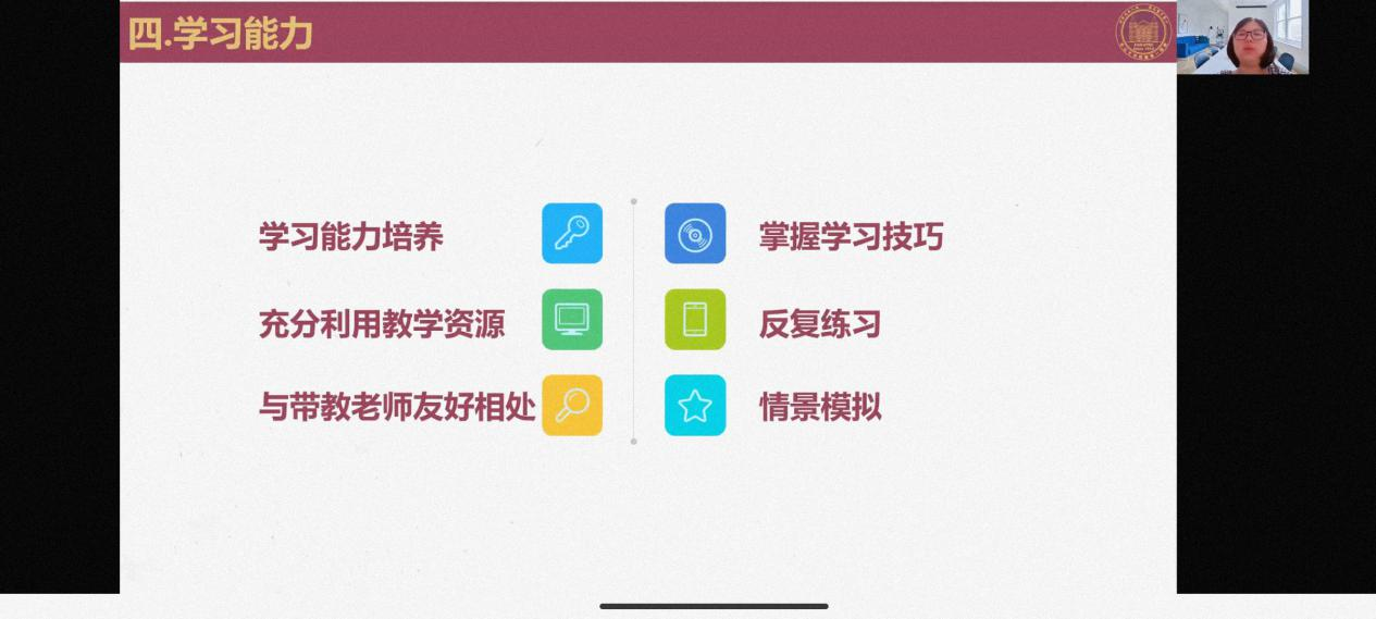 最后,王萍师姐针对学习能力的培养、掌握学习技巧、充分利用教学资源等方面与同学们探讨学习方法。