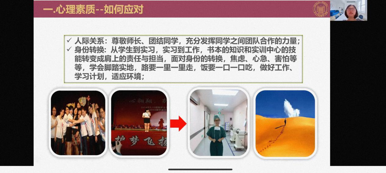 王萍师姐提到实习护士在实习过程中会面临工作学习、医患关系、人际关系、身份转换、感情生活等很多问题,这些问题很可能会导致内心焦虑。师姐为我们分析了出现这些压力,并且提出如何处理好该类问题,从而释放压力。