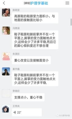 ③整合线上资源:基于疫情现状,转变教育观念,积极准备线上教学,将教学视频、课件、教案、试题、作业等资料上传到“超星学习通”网络平台。课程中整合签到、抢答、投票、主题讨论等活动调动学生积极性。指导学生观看舞蹈“飞天”视频,结合力学原理发表评论;发布讨论“穿高跟鞋为什么会走路不稳”等,针对护生们的回答,给予针对性的指导和解释。