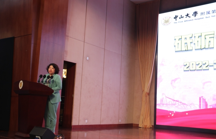 汇演的最后,我院执行院长王秀岚教授也受邀上台致辞,王院长感谢中山一院一直以来对我院实习工作的支持,目前中大附一已经为我院培养了15届实习生,共600多名。中大附一有最好的临床带教师资,最温情的工作氛围,最严格的教学标准,我们的学生经过10个月的淬炼,成为了最好的自己。