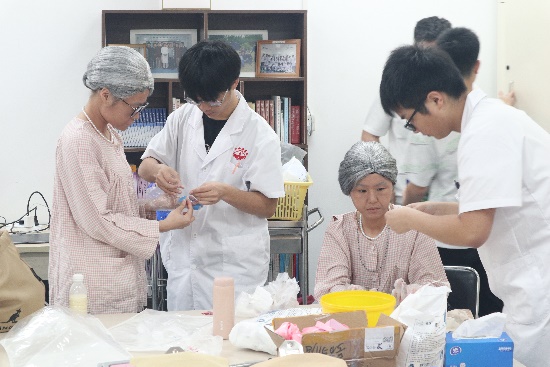 赛前准备阶段,工作人员以及志愿者们严谨有序,化妆师们一丝不苟地为标准化病人们打理妆容。