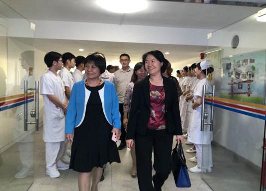 同学们仪表端庄,站姿挺拔地在护理实验实训中心门口排列整齐,准备迎接陈利芬副主任等老师们的到来。