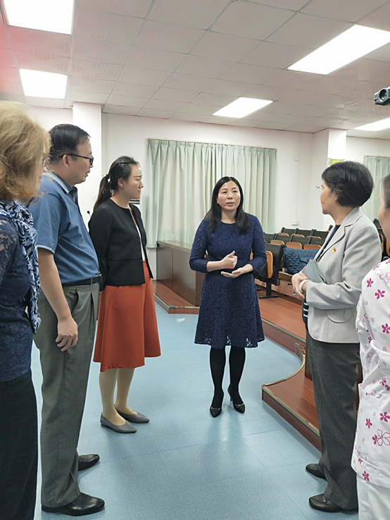 (左一:首席教授Susan Holli Neidlinger;左二:张建林教授;左三:副院长陈千;右三:中山五院陶红梅副主任;右二:校党委周云书记;右一:实验室黄廷芬老师)