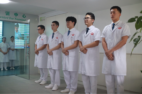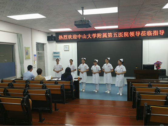 在同学们紧张又期待的等待中,中山大学属第五医院护理部陶红梅主任等一行三人到达我院护理实训中心,在同学们整齐划一的欢迎队列中亲切地与大家招手,并在我院执行院长王秀岚教授、首席教授Susan Holli Neidlinger、副院长陈千副教授、指导老师张建林教授等热情接待,并带领参观了我院的护理实验实训中心。恰逢学校党委周云书记来实验室视察工作,也与陶主任简单交流了实习生招聘工作的事宜,接着,实习生面试工作在护理实验实训中心正式开展。