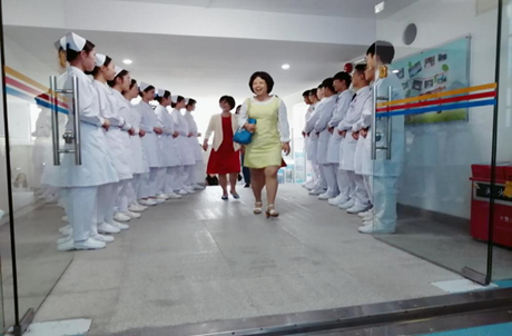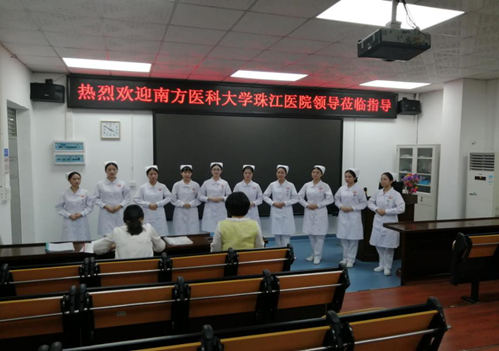14点30分,珠江医院毛惠娜护长和张弛老师在我院王秀岚院长、办公室主任黄洛莹等老师的陪同下走进了护理实训中心,同学们整齐划一地问候,热烈鼓掌欢迎她们的到来。
