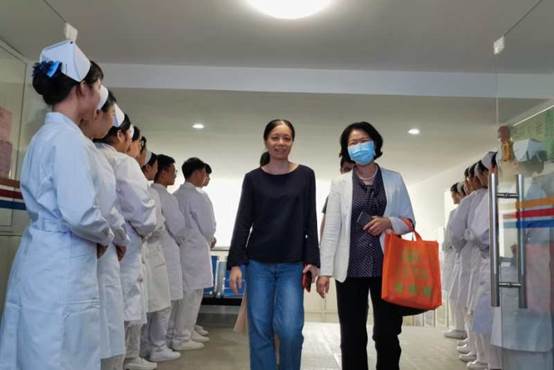 面试开始前,同学们分为8人一组,党总支书记于凤兰和实训室主任黄廷芬为同学们整理仪容,纠正站姿,老师对大家满满的爱护,同学们用自己挺拔的站姿,朝气蓬勃的面孔,极力呈现护理学生良好的礼仪素质来回报为他们操心的老师们。