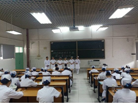 首先,同学们身着全套护士服并且带好自己的简历准时到达模拟面试地点,有条不紊地分好组,6至8人一组。此次模拟面试的形式为一分钟自我介绍,几组同学自我介绍完毕后,老师们针对同学们存在的一些问题提出了建议,麦老师指出,面试时,声音应洪亮清晰,眼睛正式前方,应该与老师有眼神交流;自我介绍时可以着重围绕和突出自己的优点,尽量向老师展示出自己自信大方的一面。梁老师提出,自我介绍完毕后,依旧需要端正站姿,不随意乱动,眼神也不能飘忽不定。