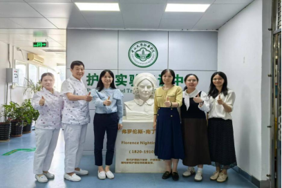 图八合影留念(左一:黄廷芬、左二:于凤兰、左三:深汕中心医院护理部颜梅、右一:钟婉、右二:深汕中心医院护理部施宝玲、右三:黄洛莹)