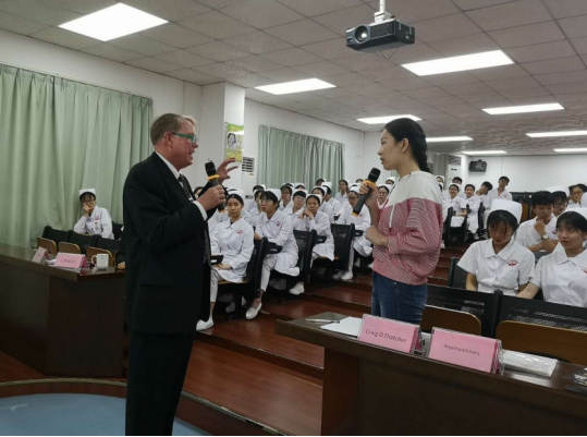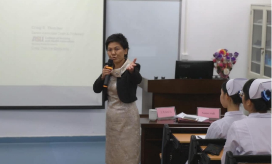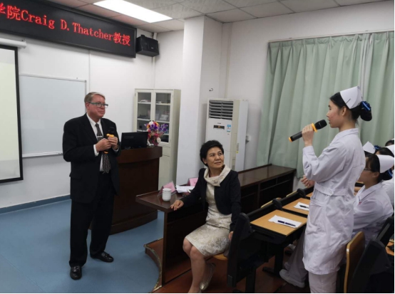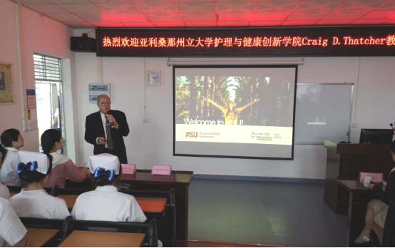 另外,Craig D. Thatcher教授为各位同学展示了美国亚利桑那州立大学护理与健康创新学院的校区建设和发展情况,并进一步介绍了护理本科、硕士、博士的培养模式,并且就师生的问题作答。Craig D. Thatcher教授介绍结束之后,同学们对于学制、学费以及该院的网络课程可及性等问题向Craig D. Thatcher教授进行了咨询,并得到了Craig D. Thatcher教授的详细解答,同时王院长也对网络课程的证书效力和“4+1+2”的培养模式等问题做了进一步的补充说明。