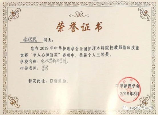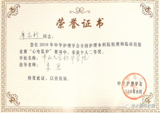 我校教师代表队由beat365中文登录入口院长王秀岚教授领队、李君教授为指导老师,参赛选手由beat365中文登录入口麦剑荣老师、徐聪聪老师和中山大学附属第三医院岭南医院廖志新护长组成。他们凭借深厚扎实的理论功底、娴熟规范的操作技能、沉着冷静的现场应对,默契合理的团队配合得到评委的一致好评,在92支参赛队中脱颖而出,最终获得团体二等奖,其中廖志新护长获“心电监护操作技术”二等奖,麦剑荣老师获“密闭式静脉输液操作技术”二等奖,徐聪聪老师获“单人徒手心肺复苏操作技术”三等奖。