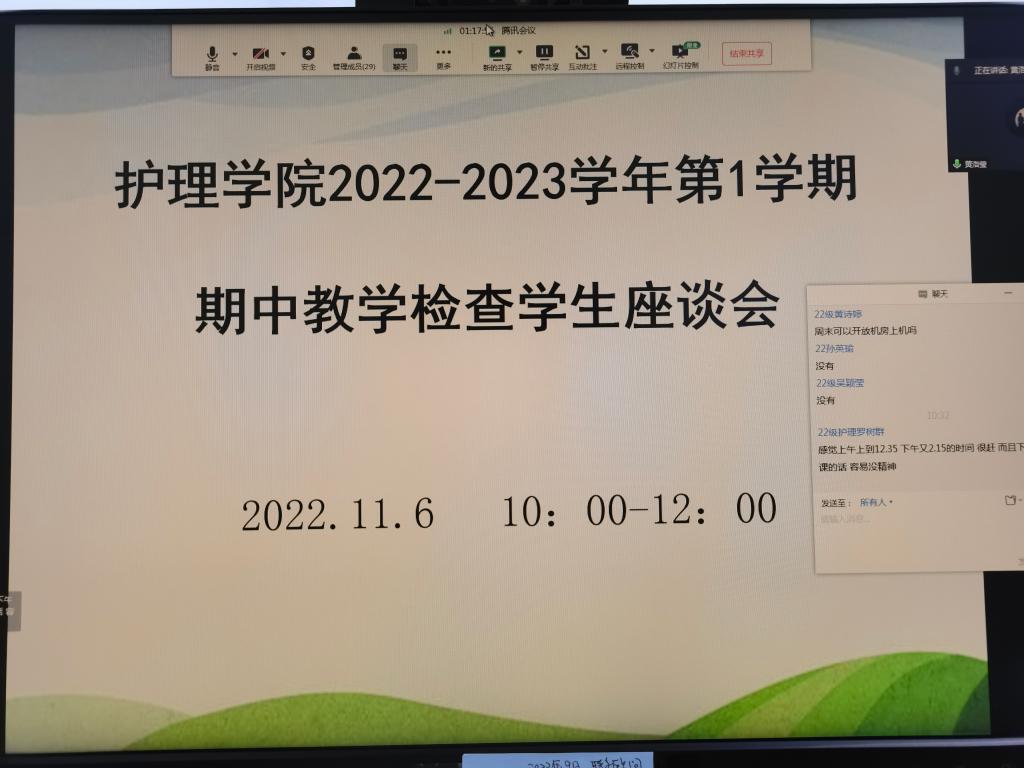 为持续加强教学过程临控与管理,结合学校对本科教育教学的要求,beat365中文登录入口于2022年11月6日10:00至12:00在腾讯会议召开了2022学年第1学期期中教学检查学生座谈会,会议由教学秘书巫碧梅主持,副院长黄洛莹、各年级辅导员以及2022级、2021级、2020级等29名学生代表按年级依次出席。