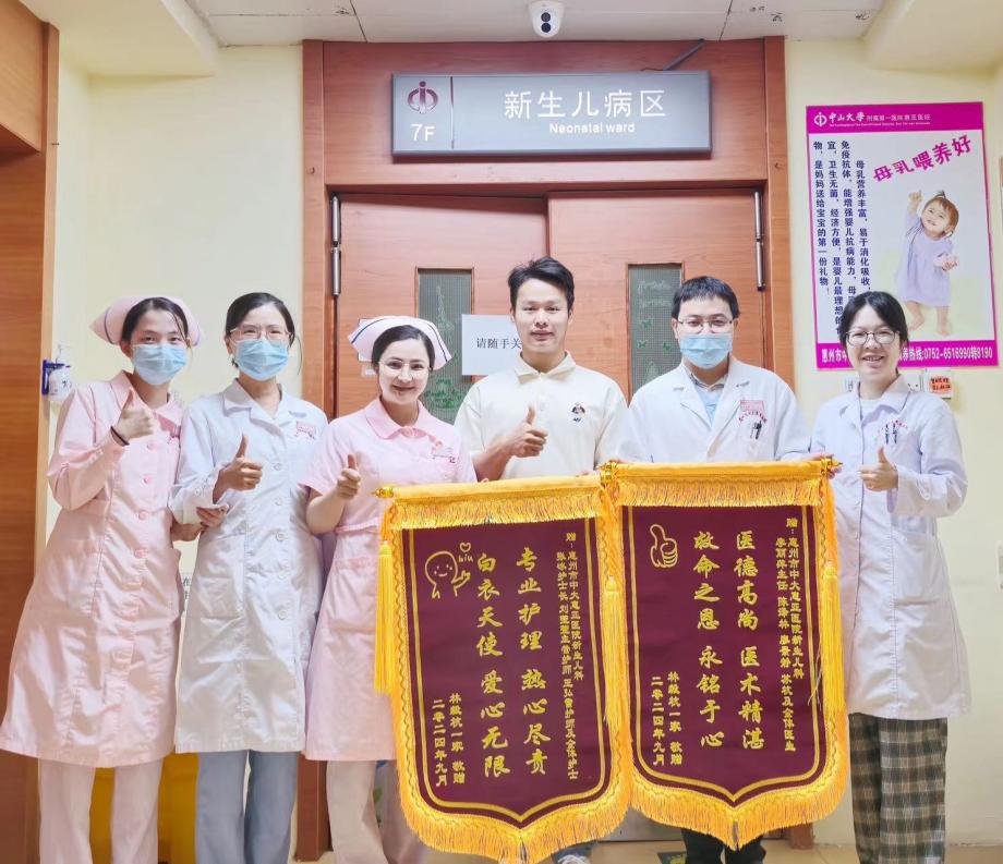 张冰(左三)与儿科医护团队获患儿家属赠旗,两面锦旗“专业护理 爱心尽责”“医德高尚 医术精湛”,诠释医患互信的温暖故事
