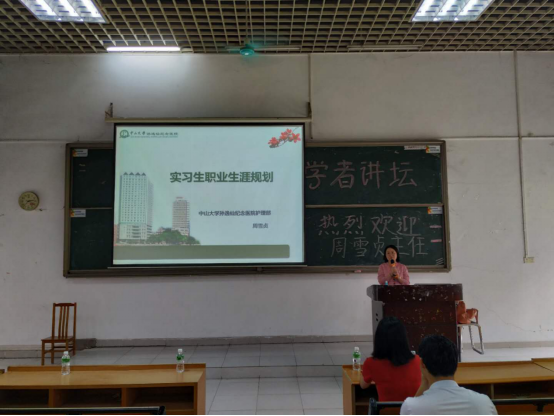 讲座伊始,陈壮艳老师对周主任进行了介绍,说明了此次讲座的重要性。接着,周主任围绕“实习生职业生涯规划”的主题,主要从医院基本情况和护士职业规划两方面为学生指点迷津。周主任结合自身的经历,增强学生的专业认同感,鼓励他们努力学习。从介绍医院的历史到医院的培训目标这个过程,着重为学生剖析当前护理的前景、护理管理构架、专科护士学习、护理管理等内容。随后,周主任为学生介绍了临床学习、规培方面的内容,再对护理管理、专科护理、科研护理、护理教师这几条职业道路的要求细细说明。这让学生对未来的职业生涯有更深入的了解。