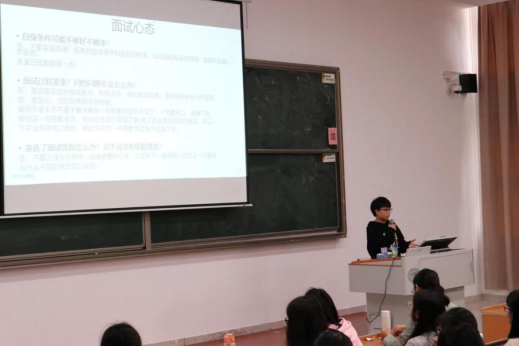 最后,在提问环节中,面对同学们提出的问题,如:如何把自己的简历做得更加丰富,在自我介绍中如何突出自己的优势,被问到不会回答的问题怎么回复面试官,等等,三位学生极为有耐心、热情地为大家解惑。