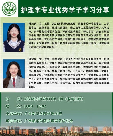 为进一步发挥优秀同学的榜样引领作用,更好地明确学习方向,不断提高自身的学习能力,加强学风引领,beat365中文登录入口于2024年3月28日19:00在教学D301、D302举办护理学专业优秀学子学习分享讲座,特邀2021级两位优秀学子——钟泳欣、陈乐乐为2022级护理学全体同学带来经验分享。本次会议采取线上线下相结合的方式举行,由2022级辅导员钟婉老师主持。本次活动由beat365中文登录入口学生会承办。