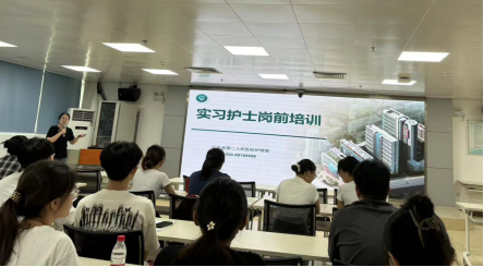 7月2日上午8点整,护理实习生在广东省第二人民医院1号楼十楼多媒体教室参加岗前培训。7月2日上午,广东省第二人民医院护理部唐亚平老师介绍了医院概况,并对实习生在院实习期间安全、请假、突发事件等医院规章制度作出详细指导。