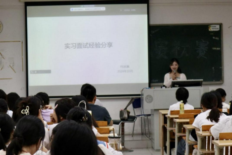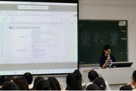 随后,吴婉钿同学与大家分享了她的实习经验。她细致耐心地介绍了各医院的面试报名条件和面试问题,帮助大家更清晰地了解了医院实习面试的注意事项。吴婉钿鼓励大家以积极的心态面对实习面试,避免不必要的焦虑。在随后的答疑环节,吴婉钿同学热情地解答了同学们的疑问,并为她们未来的实习面试提供了宝贵的建议。