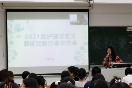 首先,2021级学生何冰琳与同学们分享面试经验。何冰琳向同学们展示了2023年医院面试名单,并阐述了选择实习医院时需要考虑的多种因素。此外,何冰琳还分享了关于“专插本”的个人学习经验。在分享结束后,她耐心地回答了同学们的问题,同学们表示收获颇丰。