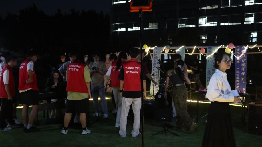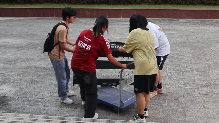 正午时分,身着统一志愿服的同学们便开启了会前筹备:几人一组抬着沉重的音响设备、灯光架往场地中央走,脚步虽沉却整齐;另有志愿者小心翼翼地搬运钢琴、吉他、口琴等乐器,用软布仔细擦拭琴身,生怕留下一丝磕碰;还有人蹲在草地上整理荧光棒、节目单,将物资分门别类摆放整齐。