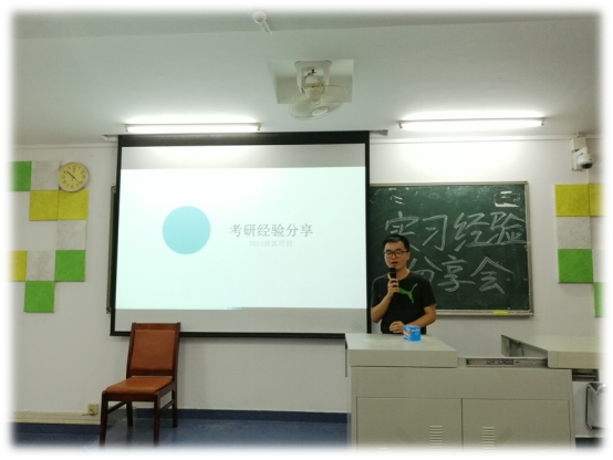 伴随着愉悦高涨的现场气氛,同学们以热烈的掌声欢迎14级郭祥健师兄上台发言。师兄以“考研经验分享”为主题,为我们开展考研背景介绍,分享其考研心得以及相关注意事项: