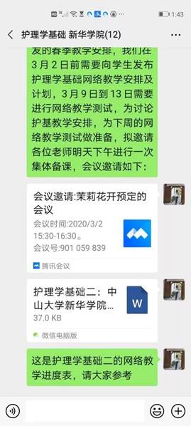 对于任课教师和学生而言,线上教学要面对教学设备、环境到教学方式的转变,各位老师在假期期间进行了充足的线上教学准备。3月2日,进行了第一次的云端集体备课,任课教师在备课时畅所欲言,对运行线上教学可能面临的问题进行积极讨论,制定疫情下护理学基础的线上教学计划,并确定于3月10日上午进行护理学基础线上课程分班测试,试运行学习通平台,对平台的各种功能进行测试。在课程准备阶段,为让学生对于课程“出入院护理”部分有直观的认识,王秀岚院长亲自去医院拍摄了“出入院护理”的实景视频;考虑到学习通平台直播卡顿的问题,任课教师均提前录制授课视频,寻找丰富的教学资源推荐给学生;为使课程测试运行顺利,在课程测试前,黄洛莹老师和张禹念老师与部分学生进行了课程测试前测试,以确保教师与学生可以顺利进行课程测试。