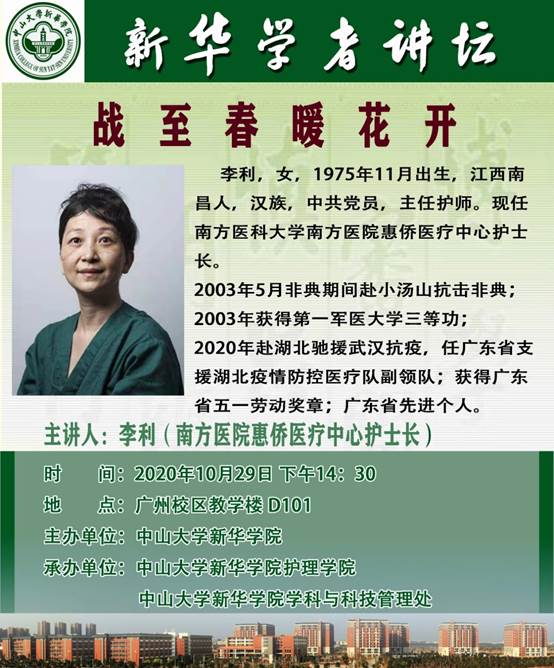 2020年10月29日下午,由中山大学新华学院主办,中山大学新华学院beat365中文登录入口、中山大学新华学院学科与科技管理处共同承办的“战至春暖花开”学者讲坛在广州校区讲学厅D101开讲。本次讲坛特邀南方医院惠侨医疗中心护士长李利担任主讲嘉宾,beat365中文登录入口执行院长王秀岚携全体师生参加了这次的讲座。