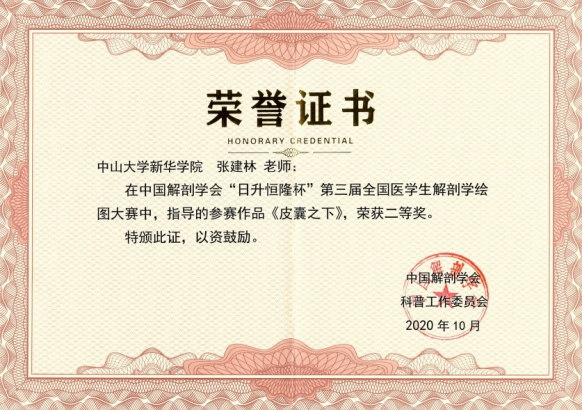 “日升恒隆杯”全国医学生解剖绘图大赛作品竞赛是由中国解剖学会科普工作委员会共同主办。本届解剖绘图大赛共收到全国180多所院校,累计2000余幅作品。经过第一轮专家评选,选出50部作品进入网络投票和专家评审,经过激烈角逐,我院肖思阳同学的作品获得二等奖。大赛充分调动了当代大学生参与解剖学绘图的积极性,激发了同学们对医学学习的兴趣。