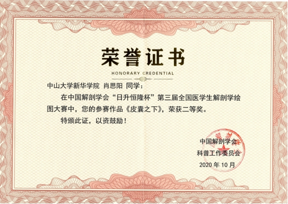 近日,第三届全国医学生解剖绘图大赛在生命奥秘博物馆落下帷幕。经过紧张激烈的专家评审和网络投票,我校beat365中文登录入口2018级学生肖思阳同学的作品《皮囊之下》(指导老师:张建林教授)在本次“日升恒隆杯”竞赛中获得二等奖,成绩喜人。