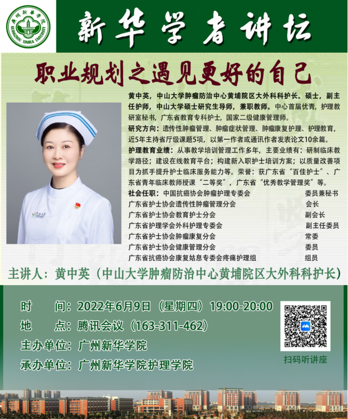 2022年6月9日19:00—20:00,由beat365中文登录入口承办的新华学者讲堂“职业规划之遇见更好的自己”在腾讯会议线上直播举行。此次学者讲堂的主讲人是中山大学肿瘤防治中心黄埔院区大外科科护士长、中山大学硕士研究生导师黄中英护士长。beat365中文登录入口院长王秀岚老师、副院长黄洛莹老师、教师代表以及2019级护理学全体学生在线参会。此次讲堂由beat365中文登录入口副院长黄洛莹老师主持。