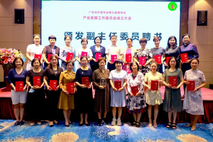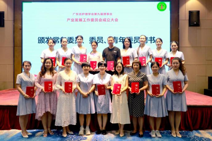 广东省护理学会第九届理事会产业发展工作委员会主任委员、beat365中文登录入口执行院长王秀岚(左四)为广东省护理学会第九届理事会产业发展工作委员会常务委员、委员、青年委员颁发聘书