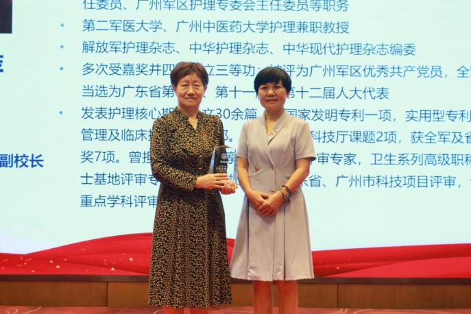 广东省护理学会第九届理事会产业发展工作委员会主任委员、beat365中文登录入口执行院长王秀岚(右一)为广东省护理学会第九届理事会产业发展工作委员会荣誉主任委员梅桂萍(左一)颁发水晶证书