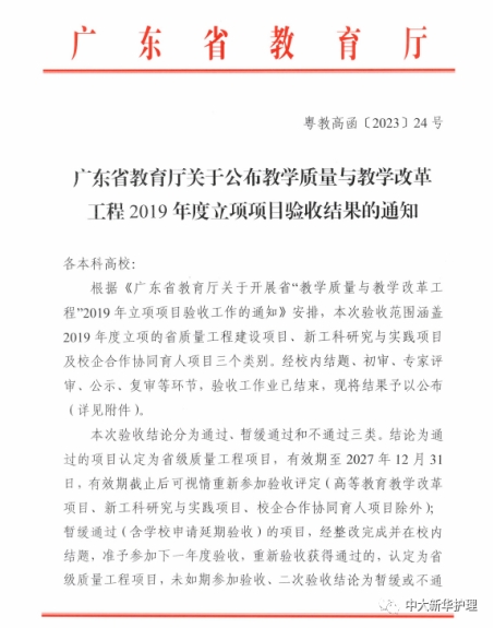 图为《广东省重点专业——护理学专业》项目通过结题验收的通知