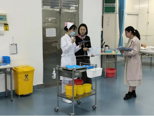 笔试环节结束,考验实操真本领的时刻到来。同学们两人一组,在领取题目后,有条不紊地开始了肌肉注射操作。在操作中,同学们除了注意细节与操作,也会不时询问患者的感受,体现了强烈的人文关怀精神。期间,医院老师惊讶于新华学子是同伴间相互练习操作,而非在模拟人上操作。面对老师,同学们回答道:“站在病人的角度感受病人的感受,才能更好地提升自己操作”。这句话,院长如是说,一代代学子如是做,教导如涓涓细流,新华护理人才也终将会源源不断地涌现。