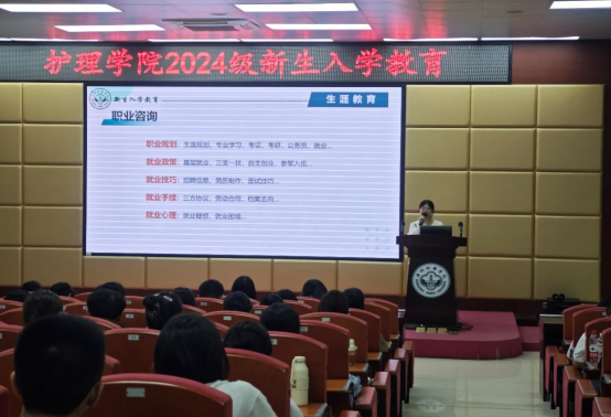 刘静老师为同学们带来了职业生涯规划和心理咨询的分享,她结合就业指导中心的资源,为新生们指明了职业发展的方向,并强调了综合发展与选择的重要性。在心理咨询方面,刘静老师分享了一些应对学业压力和人际关系困扰的有效方法。她提到,心理健康对于职业发展同样重要,只有保持良好的心理状态,才能更好地面对挑战和把握机遇。她还介绍了学校心理辅导中心提供的服务,鼓励同学们在遇到心理困扰时,及时寻求专业帮助。