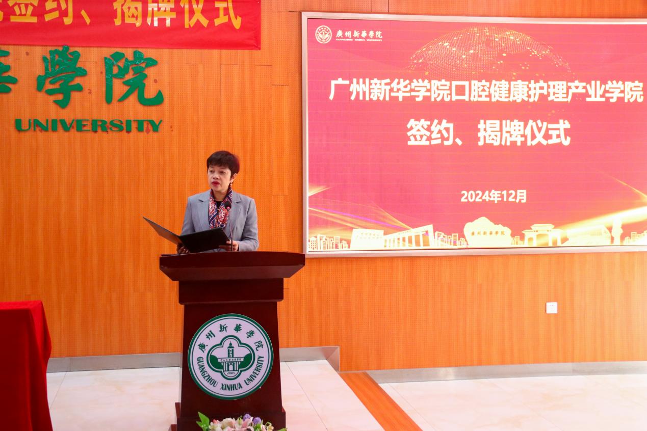 我校人力资源管理处郑锦伍副处长宣布口腔健康产业学院成立,并代表学校宣读人事任命:由beat365中文登录入口beat365中文登录入口执行院长王秀岚担任口腔健康产业学院院长,洪水清、林丽娜担任副院长。