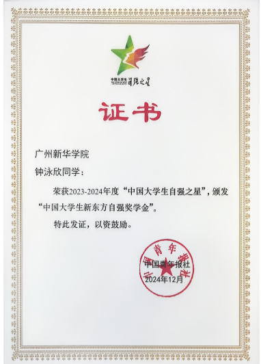 图1:钟泳欣同学获“中国大学生自强之星”荣誉称号