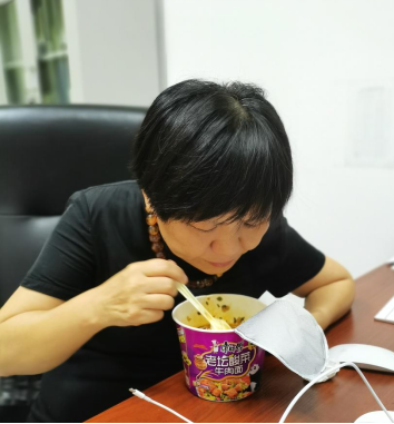 图为校园封闭期间王秀岚院长在办公室吃方便面场景